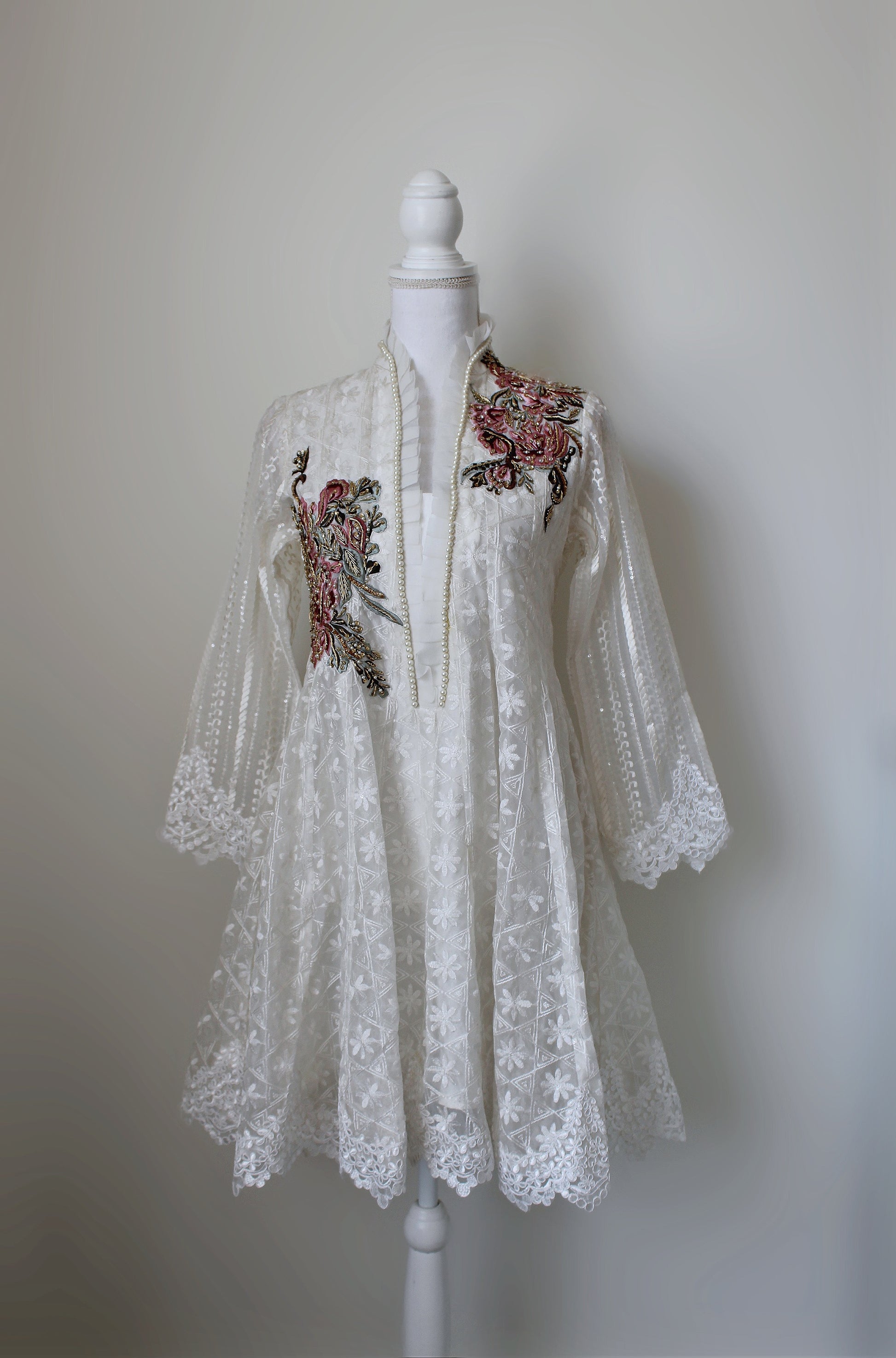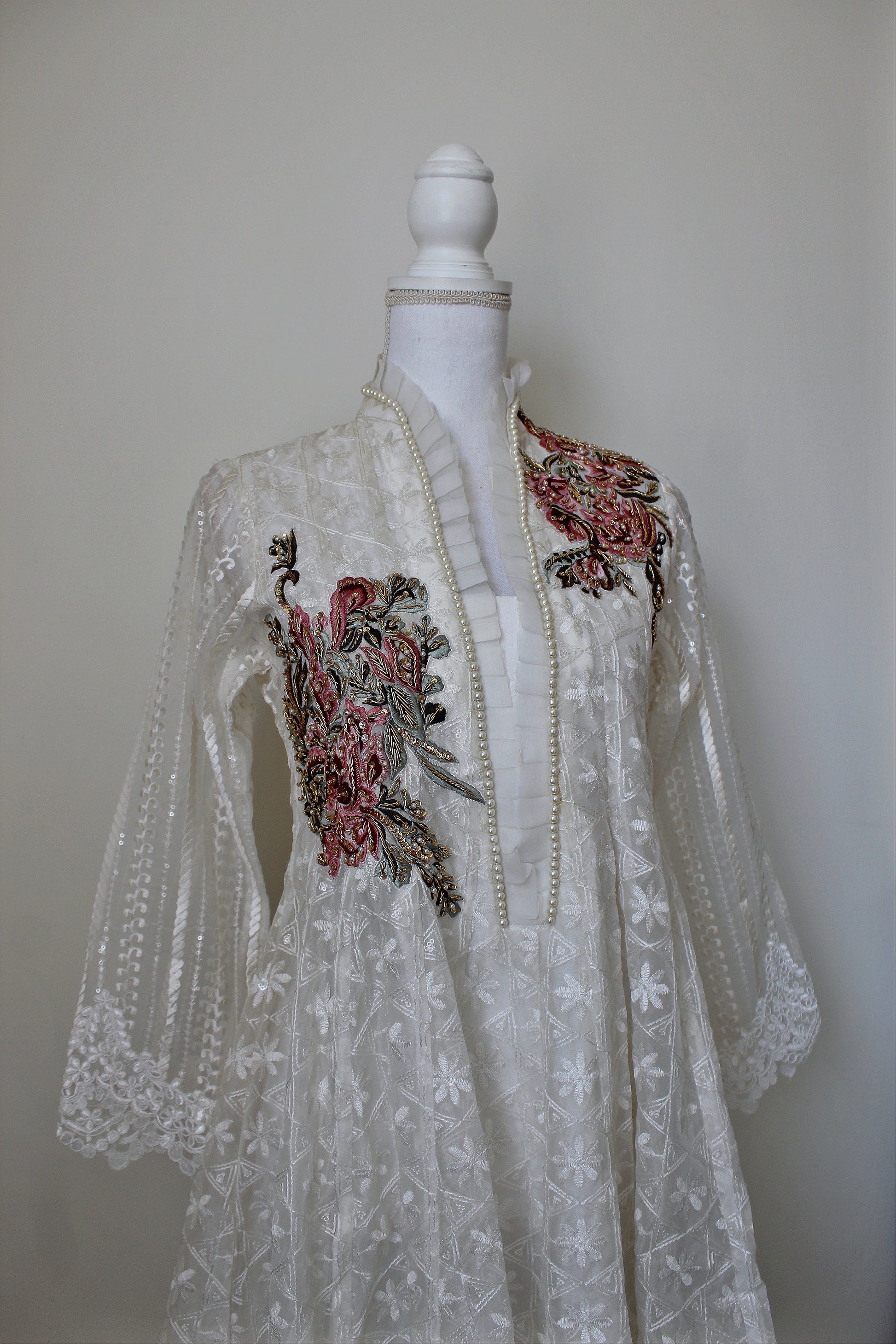 EMBROIDERED ORGANZA WITH MACHINE AND HANDWORK DETAILS. PAIRED WITH A EMBROIDERED SOFT ORGANZA DUPATTA AND PLAIN WHITE TROUSERS.